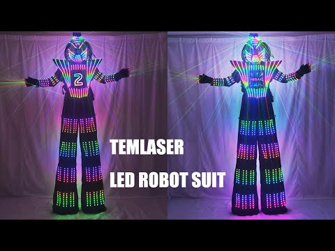 White Silver Leather Luminous LED Robot Costume - Full Color Chest Display, Stilt Walking & Laser Glove Helmet