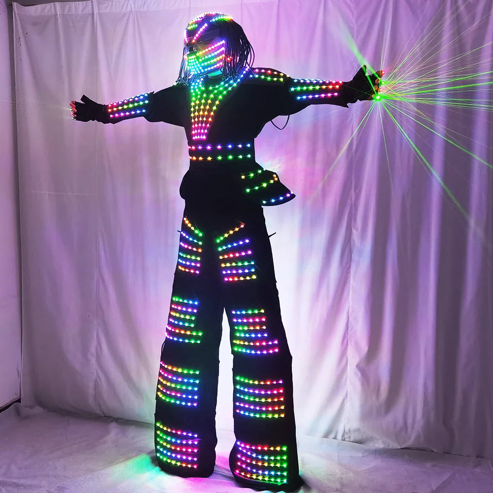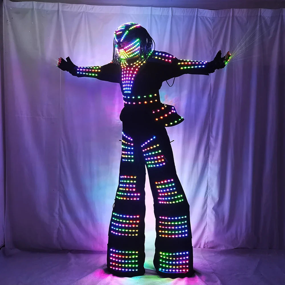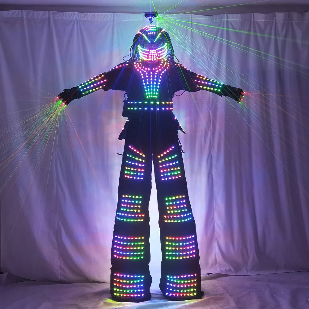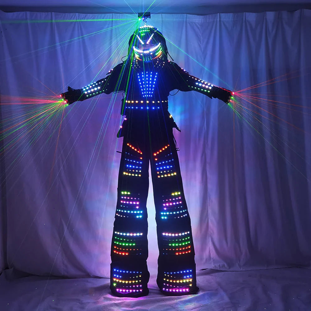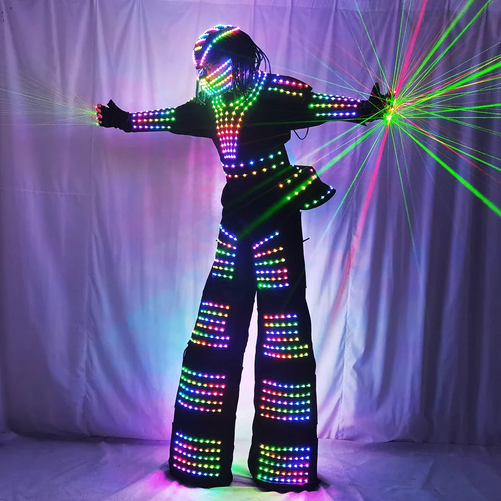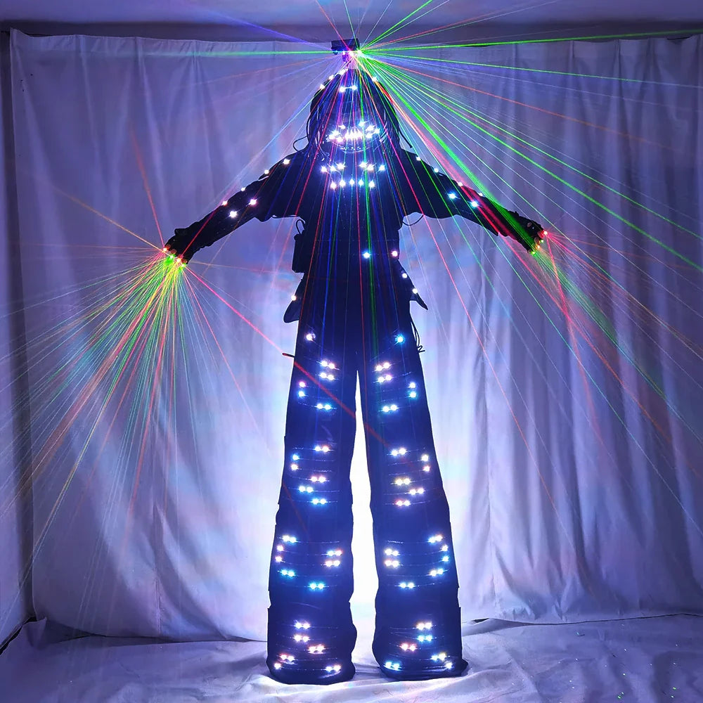 LED Robot Costume David Guetta Suit Silver White Leather Stilts Walker Costume with Laser Gloves Helmet Amosphere Prop